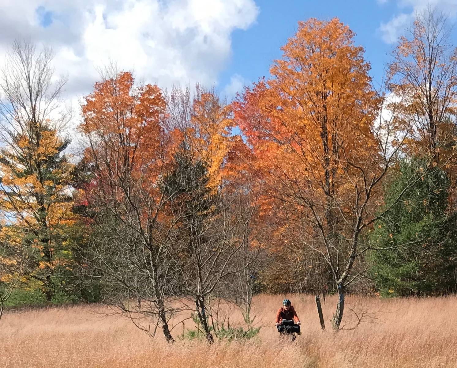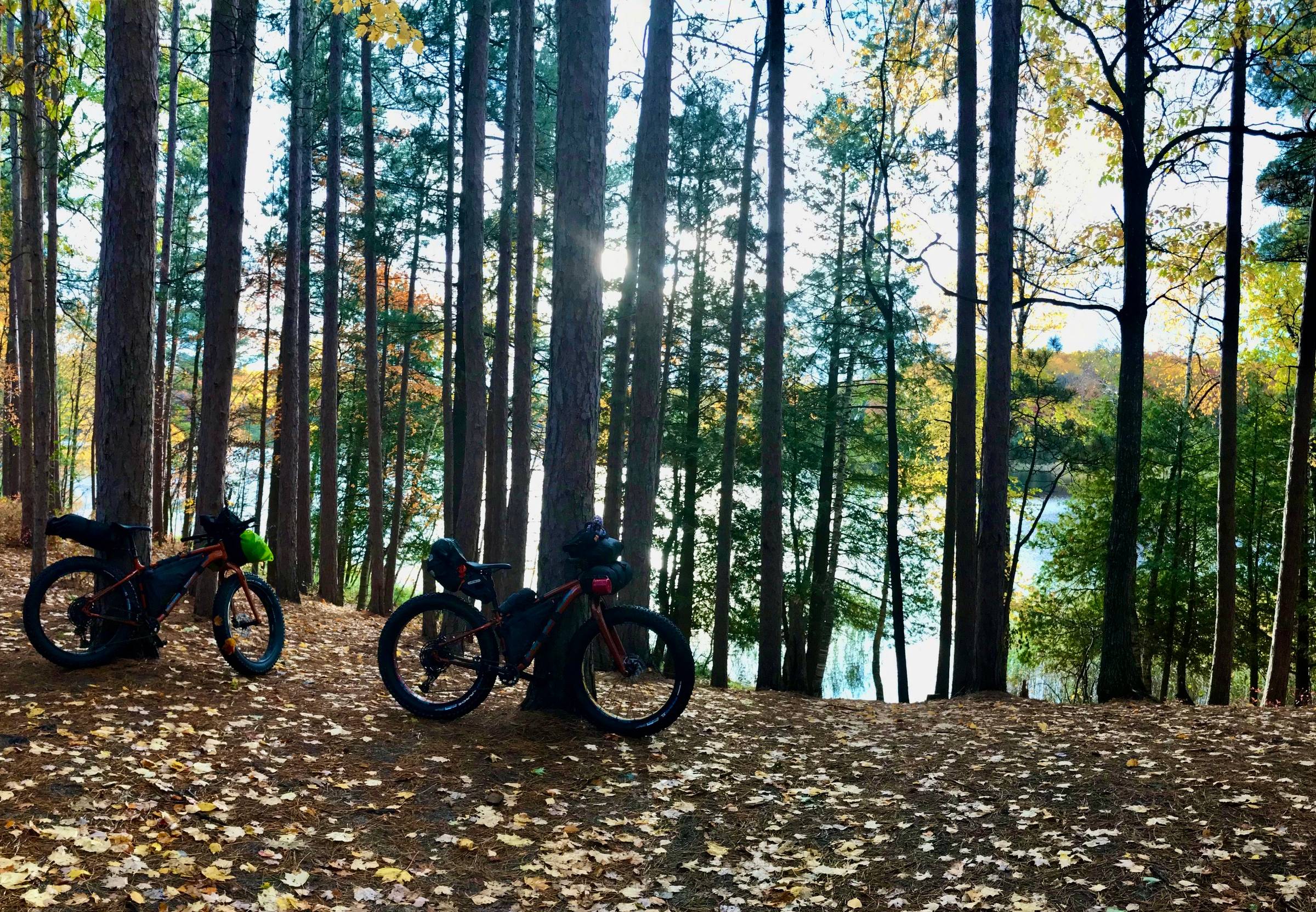 We arrived in Kalkaska on a late morning in October, planning to be on the trail no later than 1pm, so that we would be assured of arriving at the campsite before dark. Since this was was meant to be a warm-up ride for further adventures up North, our route wasnât long âonly about 15 miles one wayâ but rolling fat-tire bikes loaded with camping gear on overgrown singletrack is definitely a slow paced activity. And with possible stops to check routing and refuel, we needed plenty of leeway.