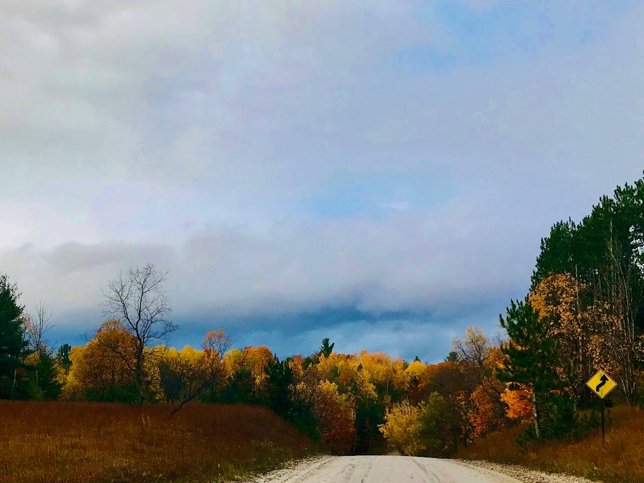 After this vigorous workout, amid lightly falling rain, we emerged onto hard pack dirt roads, and stopped under the flame-orange tree canopy for a bit of hot tea. These rolling country roads took us most of the rest of the way to Gurnsey Lake state campground where we planned to spend the night.